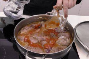 Añadir el vino, agua y tomate fritoActo seguido, ponemos el vino blanco, el tomate frito y añadimos la carne de nuevo. Pondremos el agua suficiente para cocer la carne, no es necesario cubrirla con el agua.