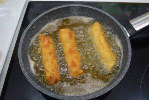 Freír los flamenquinesA continuación, pondremos aceite a calentar en una sartén y cuando esté caliente, freiremos los flamenquines a fuego medio.