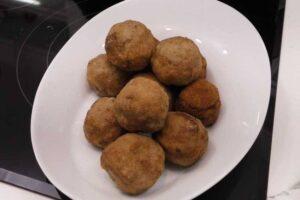 Montamos los huevos escocesesUna vez hecha la carne y con su correspondiente reposo, procedemos al montaje de los huevos escoceses. Previamente tendremos que haber cocido y pelado unos huevos de codorniz. Luego cogemos un poco de carne y envolvemos un huevo con ella. Después pasamos la pelota de carne por harina, huevo y pan rallado.