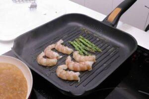 Cocinar los gambones y las yemasMientras se hace la merluza, cocinaremos los gambones y las yemas de los espárragos en la plancha con un poco de aceite de oliva y sal.