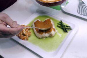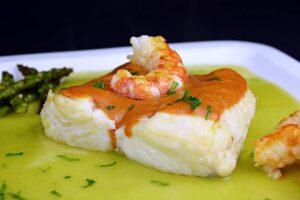 Montar el plato de merluza con dos salsasEn que tengamos todo hecho, presentaremos el plato cubriendo el fondo con la crema de espárragos, colocando la tajada de merluza en el centro, unos gambones y unos espárragos por ahí colocados como más nos guste y finalmente pondremos una cantidad al gusto de salsa de marisco por encima de la merluza.