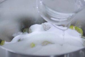 Poner los ingredientes en la cazuelaA continuación, ponemos toda la fruta, el azúcar y un poquito de agua, en la cazuela donde vayamos a preparar la mermelada. Encendemos el fuego, tapamos la cazuela y esperamos a que se caliente. El agua la ponemos para que el azúcar no llegue a pegarse en el fondo de la cazuela al principio.