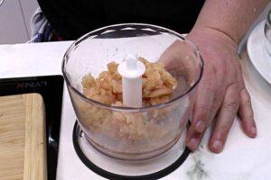 Picar la carne de polloComenzamos cortando la pechuga en trozos y moliéndola en el accesorio para picar que viene con la batidora. También podéis pedir la carne ya picada en la carnicería.