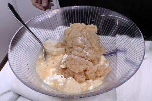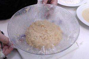 Dejar macerar la carne de los nuggets de polloMezclaremos todo hasta conseguir una pasta uniforme y taparemos el bol con papel film transparente. Luego lo meteremos al congelador y tendremos ahí la pasta durante 20 minutos.
