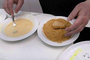 Empanar los nuggets de pollo caserosPasado ese tiempo, sacaremos el bol y procederemos a dar forma y empanar los nuggets. Cogemos un poco de la pasta y le damos forma a nuestro gusto. A continuación, lo pasaremos por harina, huevo y el pan rallado especial para nuggets.