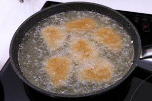 Freír los nuggetsActo seguido los iremos friendo en abundante aceite a fuego medio, para que se hagan bien por dentro sin quemarse por fuera.