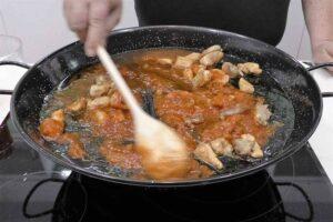 Cocinamos los pimientos y el pollo al ajilloPara no perder mucho tiempo, vamos a cocinar los pimientos cortados en tiras en una sartén y el pollo troceado en otra.Lo primero es quitar las semillas al pimiento y cortarlo en tiras, los ponemos al fuego con aceite en una sartén y vamos a cocinarlos hasta que se ablandan lo necesario. Una vez hechos los reservamos y en cuanto se enfrían le vamos a quitar la piel que se suelta muy fácil.Por otro lado vamos a cocinar el pollo, lo vamos a limpiar de pieles y grasas. Lo troceamos en trozos más bien pequeños y lo cocinamos junto a los ajos pelados y troceados en la plancha, con no mucho aceite hasta ver como se doran los trozos. Preparamos el sofritoUna vez tengamos todo hecho, nos ponemos a hacer el sofrito. Ponemos la paella al fuego con aceite de oliva, el bote de pisto casero (que es un preparado de verduras variadas con salsa de tomate) y el pollo ya frito. Integramos todos los ingredientes cocinando unos minutos. Añadimos el agua y arrozCon el sofrito ya integrado, tenemos dos opciones. La que puedes ver en el vídeo es que ponemos el agua y cuando está caliente añadimos el arroz, el colorante y sazonamos.La otra y que es mi favorita, ponemos el arroz en el sofrito bien sazonado, le añadimos el colorante y rehogamos para que el arroz se empape bien con los sabores del sofrito. Tras un par de minutos, añadimos el agua o caldo bien caliente para terminar de hacer el arroz a fuego muy vivo, que no pare de hervir el arroz en ningún momento. Controlamos el fuego y añadimos el pimiento rojoLos primeros 10 minutos de cocción, debe estar a fuego vivo y a partir de ahí vamos regulando el fuego para que siga hirviendo fuerte pero con menos agua no necesita tanto fuego. Tres minutos antes del final, ponemos las tiras de pimiento colocadas de forma decorativa. El tiempo de cocción del arroz varía dependiendo del fuego y el recipiente en el que lo hacemos, suele hacerse entre 15 y 20 minutos y son importantes dos detalles. No debes remover el arroz para que no suelte almidón y se queme en el fondo y por otro lado, no debes añadir más caldo. Si se seca rápido, contrólalo con la intensidad del fuego. A mi me gusta retirar del fuego cuando le falta un poco y dejar que alcance el punto recociéndose durante 5 minutos. Servimos y disfrutamosPasados los 20 minutos totales, comprobamos a ver como está. Si está casi hecho, lo retiramos del fuego y lo tapamos con un trapo o una tapa con agujeros para que se evapore el resto del caldo y termine de hacerse. Después de 10-15 minutos, ya podemos sentarnos a comer este delicioso arroz con pollo al ajillo. Hasta aquí la receta de hoy amig@s, mañana volveré con una nueva receta salada aquí, en Cocina Familiar.
