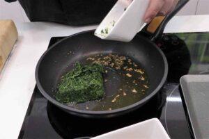 Comenzamos preparando el revuelto de espinacasComenzamos preparado el revuelto de espinacas. Picamos un diente de ajo muy fino y lo ponemos a sofreír en una sartén con aceite de oliva cubriendo el fondo. Cuando empiece a dorarse, ponemos las espinacas (descongeladas, lógicamente) y las rehogamos un poco.