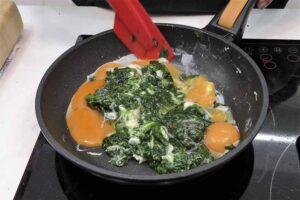 Le agregamos los huevos a las espinacasPonemos un poco de sal, removemos y después de un par de minutos añadimos los huevos. Antes de romper las yemas, cocinaremos un poco la clara. Después rompemos las yemas y removemos hasta que se cuajen, pero sin pasarnos. Queremos un revuelto cremoso.
