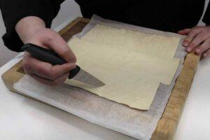Cortamos el hojaldreCon el revuelto terminado, extendemos la plancha de hojaldre en una superficie plana y realizamos unos cortes en las 4 esquinas, dejando una solapa en el centro. Luego en los laterales (que han quedado más cortos) hacemos unos cortes desde el centro hasta el borde ligeramente en diagonal, procurando que en ambos lados sea el mismo número. En la foto podéis ver mejor lo que trato de explicar.