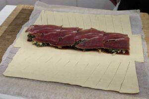 Colocamos el revuelto sobre el hojaldre con unas lonchas de jamónAhora colocamos unas lonchas de jamón en el centro cubriéndolo todo a lo largo y a continuación, añadimos el revuelto de espinacas encima. Finalmente tapamos el revuelto con más lonchas de jamón.