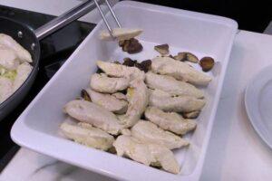 Colocar las setas y el pollo en la bandejaUna vez tengamos todo cocinado, colocamos las setas en el fondo de una bandeja profunda y encima ponemos el pollo.