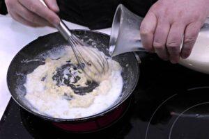 Preparar la bechamelAhora prepararemos la bechamel sencilla para gratinar, cuya receta completa podéis ver PULSANDO AQUÍ. Una vez terminada, la pondremos por encima del pollo.