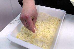 Poner la bechamel y el queso por encima del polloFinalmente, pondremos abundante queso rallado por encima y encenderemos el gratinador del horno y ponemos la parrilla en una posición del centro hacia arriba, para que se gratine más rápido.