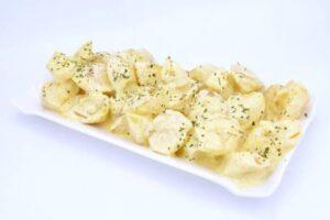 Mezclar las patatas con el alioliPor último vamos a montar el plato de patatas con salsa alioli. Las patatas que teníamos peladas se trocean, se les añade la salsa y ponemos un poquito de perejil picado por encima.