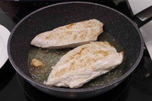 Sellar y cocinar las pechugas de polloComenzamos poniendo aceite de oliva cubriendo el fondo de una sartén, ponemos los ajos y cuando comiencen a dorarse, marcamos las pechugas de pollo (habiéndoles puesto sal previamente) para que luego no se escape todo el jugo. Unos 3 minutos por cada lado son suficientes si tapamos la sartén.