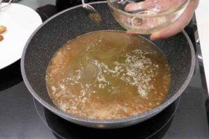 Cómo hacer salsa de miel y mostazaUna vez hechas las pechugas, nos ponemos con la salsa. Utilizando la misma sartén, ponemos el vino blanco y removemos un poco para soltar todo el jugo que queda un poco pegado de la fritura del pollo. Luego ponemos la miel, la mostaza, un poquito de agua, una pizca de sal y finalmente la nata líquida (crema de leche).