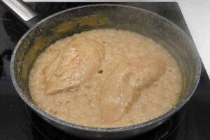 Cocinar las pechugas con la salsa de miel y mostazaPonemos un poco más de agua y removemos. Luego colocamos las pechugas junto a la salsa y le damos fuego alto hasta que comience a hervir.