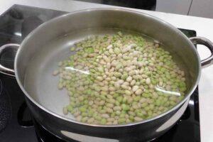 Poner a cocer las pochasComenzamos poniendo una cazuela con agua a calentar y cuando esté hirviendo ponemos un puñadito de sal y las pochas. Estarán cociendo a fuego lento durante 25-30 minutos.
