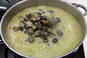 Trituramos la salsa y la añadimos a las pochas junto con las almejasAhora cogemos un poco de caldo de las pochas y trituramos con la batidora. Con las pochas cocidas y la salsa triturada, tenemos que añadir la salsa a la cazuela de las pochas. Luego pondremos las almejas, que previamente habremos puesto en agua con sal para que suelten todas las impurezas (como arena) que llevan dentro.