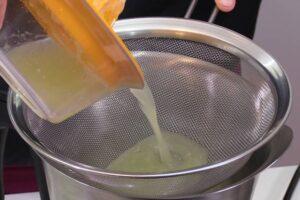 Añadimos el zumoAhora vertemos el zumo en la jarra a través de un colador para evitar que caigan pulpa o semillas. La mayoría se habrá quedado en el exprimidor, pero siempre cae algo al zumo.