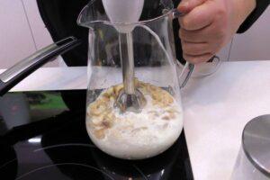 Una vez frías mezclamos con lecheAhora esperaremos a que se enfríen las castañas hasta que no nos quememos al tocarlas, pero cuidado que engaña porque la piel puede no quemar pero el interior guarda mucho más el calor. En que estén lo suficientemente frías, las pelaremos y trocearemos un poco. Acto seguido las pondremos en un vaso medidor junto a la leche y trituramos con la batidora.