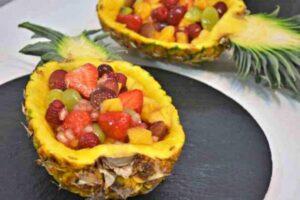 Terminamos la macedoniaPara terminar de hacer la macedonia, cortamos la piña en trozos y lo añadimos al resto de las frutas, dando unas vueltas para que también coja liquido la piña. Dejamos reposar un poco y solo tenemos que poner la fruta en el interior de la cáscara de la piña, así ya podremos disfrutar de una macedonia riquísima.