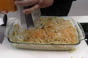 Tras rehogar las pasta la ponemos en una fuenteRehogamos la pasta unos minutos para que coja bien el sabor del ajoaceite y la volcamos en una bandeja de cristal grande. Ahora vamos rallando cada queso a nuestro gusto y encendemos el horno con el gratinador a 200 grados centígrados.