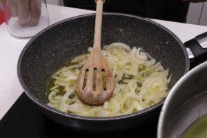 Comenzamos preparando el sofritoComenzamos haciendo el sofrito picando la cebolla y los ajos, y poniéndolo todo en una sartén con aceite de oliva.