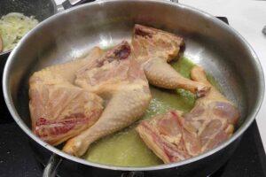 En una cazuela cocinamos las zancas de polloPor otro lado, en una cazuela amplia, ponemos aceite de oliva y cuando esté caliente, colocamos las zancas de pollo, previamente sazonados, con la piel hacia abajo para cocinarlos. Vamos dándoles vueltas para que se cocinen uniformemente.