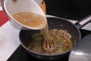 Cuando la cebolla y ajo se doren agregamos azúcar moreno, a continuación ponemos el zumo de limó y la cervezaCuando se doren la cebolla y el ajo, le añadimos el azúcar moreno. Removemos para que se disuelva y cuando lo haga, ponemos el zumo de limón y la cerveza. Dejamos que se cocine todo junto durante 5 minutos y luego lo trituramos.
