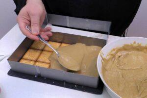 Seguimos colocando capasContinuamos poniendo una capita de crema pastelera de café y luego de nuevo galletas empapadas en leche. Así hasta que lleguemos al final teniendo en cuenta dos cosas: la última capa debe ser de galletas y hay que tener en cuenta la cobertura de chocolate, así que no podemos terminar en el borde del molde.