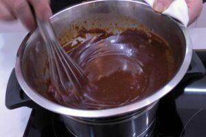 Preparamos la ganache de chocolatePara hacer la cobertura de chocolate, pondremos un bol metálico sobre una cazuela con un poco de agua para hacer el baño maría. El fuego debe estar a baja intensidad, puesto que el agua no puede llegar a hervir. En el interior del bol pondremos el chocolate troceado y la mantequilla, esperando a que se derritan del todo para mezclarlos a la perfección.