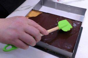 Una vez templada cubrimos la tartaUna vez terminada, esperaremos a que se atempere un poquito y la vertemos con cuidado sobre la tarta, incluso poniendo una cuchara debajo del chorro para que el impacto sobre las galletas sea menor. Luego la extendemos bien con la ayuda de una lengua y esperamos a que se solidifique.