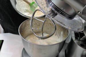 AmasamosA estas alturas, ya habremos puesto la parte líquida de la masa, que hemos batido anteriormente en el bowl de la amasadora. Iremos integrando la harina poco a poco y amasando un mínimo de 5 minutos.