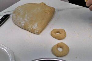 Formamos las rosquillasPasado el tiempo de reposo vamos a formar las rosquillas. Tomamos pequeñas porciones de masa, las hacemos una bola y la aplanamos, hacemos un agujero en el centro y ya está… Ya hemos hecho nuestra primera rosquilla.