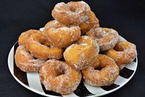 Terminamos las rosquillasUna vez fritas las pasamos a una fuenta en la que habremos puesto papel absorbente y finalmente las bañaremos en azúcar.