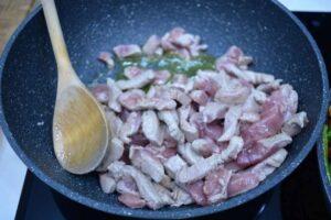 Cortamos el solomillo en tiras y lo cocinamos en una sartén, le agregamos una copa de brandy y flambeamosEn el rato que se va cocinando la verdura, vamos cortando el solomillo en tiras y lo ponemos a cocinar en una sartén con aceite de oliva, previamente salado (el solomillo, claro). Cuando esté ya cambiado de color, añadimos la copa de brandy y flambeamos. Siempre recuerdo que al flambear, no se puede hacer debajo de un extractor ni siquiera estando apagado, porque podéis preparar un incendio. Una vez se haya extinguido el fuego dejamos que se cocine un poco más y cuando ambas cosas estén a medio hacer, las juntamos en un mismo recipiente para que terminen de hacerse juntas.