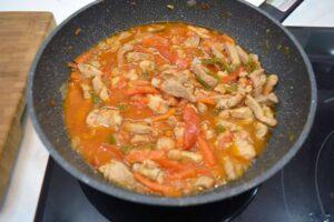 Una vez tenemos el solomillo con las verduras dejamos cocinar a fuego lentoTenemos que cocinar este solomillo de cerdo guisado a fuego lento, porque queremos que la carne quede muy tierna. Un rato después, comprobamos el punto de sal y le ponemos pimentón picante al gusto. Un poco antes de que termine de hacerse, añadimos la salsa de tomate frito y lo dejamos cocinando otros 10 minutos a fuego lento.