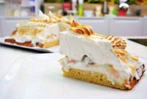Preparamos el souffléSobre la placa de bizcocho pondremos láminas de la barra de helado de nata que habremos cortado. Después, encima del helado, vamos poniendo las frutas en almíbar escurridas hasta cubrirlo. Ahora tenemos que poner una buena capa de merengue encima y extenderlo para que cubra todo el helado y la fruta.