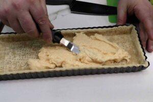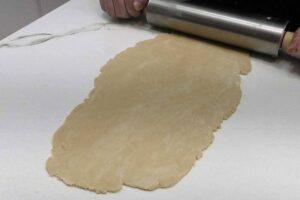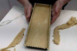 Estiramos la masa quebrada con un rodillo hasta que tenga la forma y grosor deseadoCuando ya tengamos ambas cosas frías, nos ponemos a hacer la tarta. Sacamos la masa de la nevera y espolvoreamos un poco de harina en una superficie plana y en el rodillo que utilizaremos para estirarla. Le damos la forma aproximada del molde que vamos a utilizar (en mi caso un molde rectangular alargado).