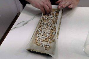 Horneamos la masa quebradaLuego colocamos un papel de horno y unos garbanzos (o unas bolitas de cerámica que venden especialmente para este cometido) para que al hornearla no suba. Encendemos el horno a 180 grados con calor arriba y abajo SIN ventilador, y cuando esté caliente metemos el molde que tendremos ahí durante 15 minutos.