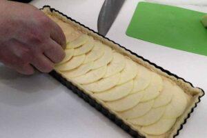 Colocamos láminas de manzana por toda la superficieAhora pelamos, cortamos por la mitad y laminamos muy fino las manzanas Golden Delicious de Marlene, y vamos colocando láminas solapadas hasta que cubramos toda la superficie de la crema.