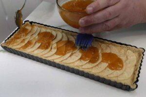 Una vez se enfríe un poco la tarta le ponemos una capa de mermelada por encimaDejamos que se enfríe un poco y le ponemos una capita de mermelada de albaricoque por encima.