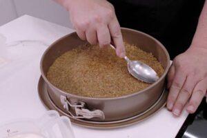 Extendemos la masa para formar la baseA continuación, volcaremos la galleta, la nuez y la mantequilla en un bol y mezclaremos todo hasta conseguir una pasta. En caso de que notéis que no empapa bien toda la galleta, tendréis que poner algo más de mantequilla. Ahora volcaremos todo el contenido en el molde y lo extenderemos de manera más o menos uniforme, procurando que la parte del borde quede un poquito más alta. Así evitaremos posibles fugas.