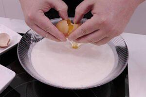 Hacemos la masa para la tartaPonemos en un bol amplio la nata líquida, los huevos y el azúcar. Batimos para que queden bien mezclados y será entonces cuando añadamos el queso mascarpone, que también mezclaremos para integrarlo en la mezcla.