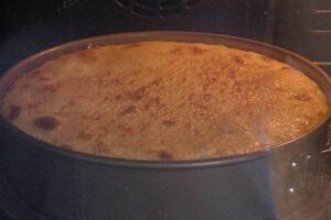 Añadimos la masa al moldeSacamos el molde de la nevera y volcamos toda la mezcla líquida en su interior, utilizando una cuchara para poner debajo del chorro y así amortiguar el golpe de la caída. Encendemos el horno a 200ºC con calor arriba y abajo SIN ventilador.