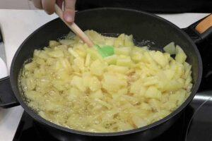 Pochamos la patata cortada a fuego lentoComenzamos pelando, limpiando y cortando las patatas en trocitos y pochándolas en una sartén con abundante aceite de oliva a fuego lento.
