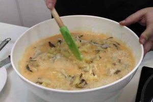 Batimos los huevos y agregamos la patata y las setasUna vez tengamos todo hecho, batimos todos los huevos en un bol y agregamos la patata y las setas bien escurridas. Mezclamos con cuidado y dejamos que repose todo junto durante 15 minutos.