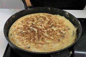 Cocinamos la tortilla a nuestro gustoEn ese punto, dejaremos quieta la mezcla hasta que se haga costra por la parte de fuera. Luego le damos la vuelta con la ayuda de un plato grande (más que la sartén) o una tapa de cazuela que no tenga muchos rebordes. Antes de volver a poner la tortilla en la sartén, pondremos otro chorrito de aceite de oliva.